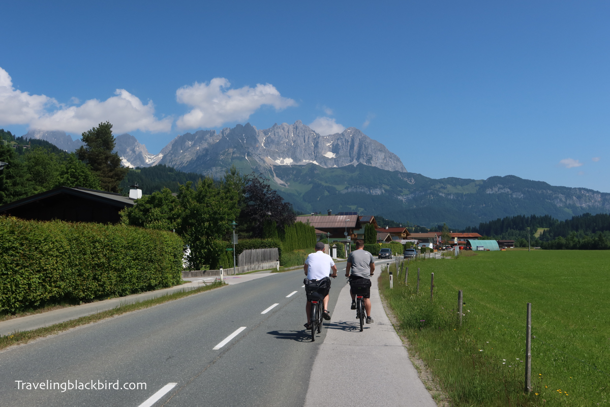 De Hohe Salve Ronde in Tirol is een vrij gemakkelijke fietsroute. Het grootste gedeelte van de route fiets je op een geasfalteerd fietspad waar je geen auto’s tegen komt. Er zijn stukken waar je langs een wat drukkere weg moet fietsen, maar dit is goed te doen. (We kregen de mogelijkheid om ook helmen te dragen, maar hebben dit niet gedaan. Dit was ook niet nodig). Op sommige stukken fiets je een aantal kilometers op een grindpad, zowel bergopwaarts als bergafwaarts. Onderweg kom je door sfeervolle dorpjes, weidse Alpenweides, rij je een heel stuk langs een rivier en kijk je uit op de hoge rotsen van de Wilde Kaiser.